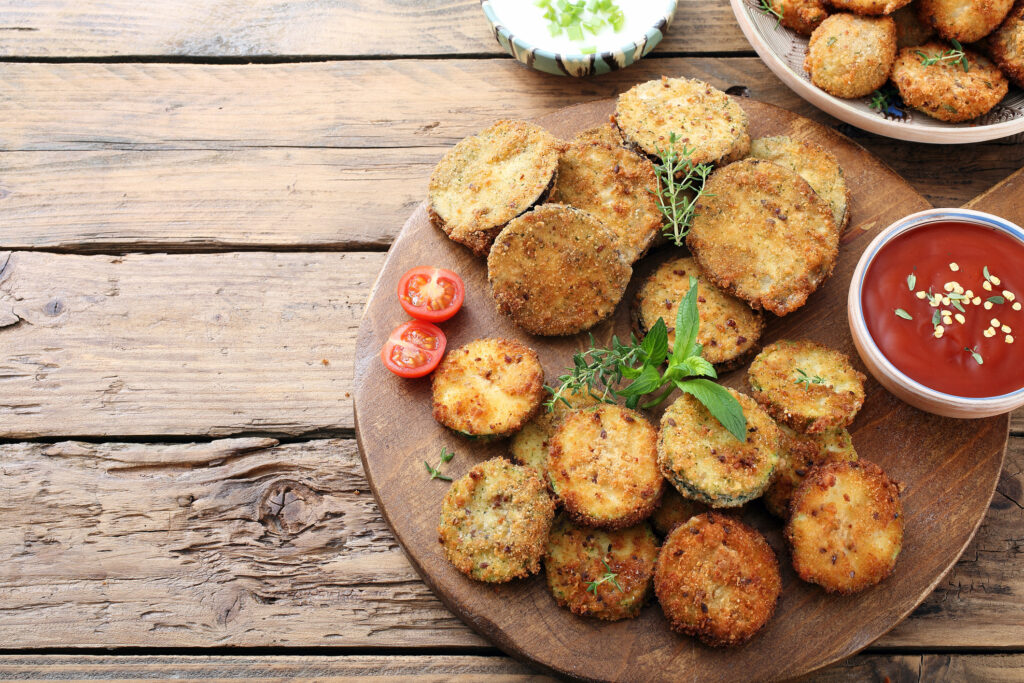 ; Passe as abobrinhas no creme, em seguida coloque na crosta de parmesão;; Coloque em uma assadeira que não grude e seja ampla sem deixar que as abobrinhas se encostem, deixe por aproximadamente 15 minutos e vire na metade do tempo deixando dourar de ambos os lados.