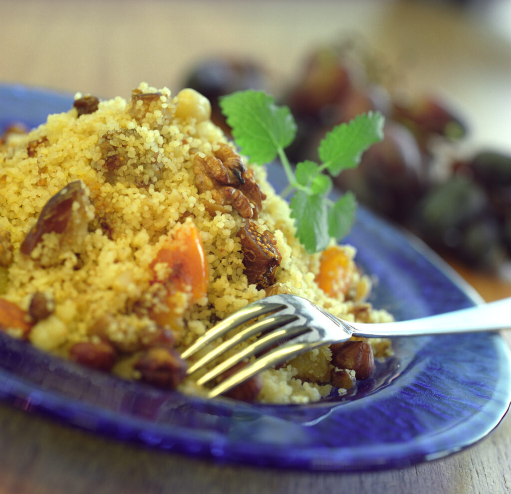 ; Cuscuz: Tempere a castanha com azeite e sal de especiarias e leve para assar até dourar um pouco, reserve em um recipiente frio;