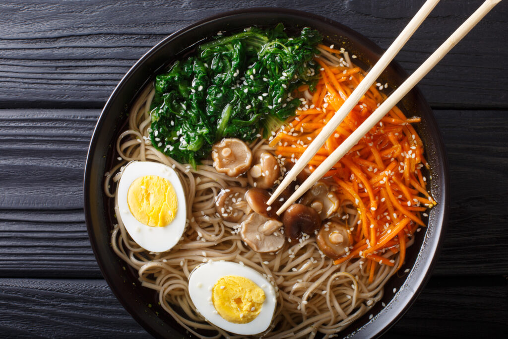 Mês 5[wpurp-searchable-recipe]LAMEN – – macarrão de trigo sarraceno (bifum ou macarrão de arroz para pad thai), Caldo: caldo de legumes (ou água com sal de especiarias), óleo de gergelim cru (ou óleo de coco), dentes de alho (picados), gengibre fresco (ralado), shoyu sem glutamato, missô claro orgânico, Molho sriracha (opcional): pimentão vermelho (sem semente), dentes de alho (ralado), gengibre (ralado), melado de cana (ou mel), sal rosa, óleo de gergelim cru (ou azeite), Cogumelos: cogumelos shitake (cortados ao meio), shoyu, suco de laranja (espremido na hora), alho em pó, azeite, Tofu: tofu defumado orgânico (em cubos de 2cm), shoyu, azeite, páprica defumada, Espinafre: espinafre, azeite, dente de alho, cúrcuma em pó, sal de especiarias, Finalização: cenoura (em finas tiras (de preferência no cortador de legumes)), ovos (cozidos por 6 a 8 minutos), gergelim branco e preto, cebolete (ou cebolinha verde finamente picada), Caldo: Aqueça 1 colher de sopa de óleo em uma panela grande em fogo médio. Adicione o alho e o gengibre e refogue por um minuto, tomando cuidado para não queimar. Adicione o caldo de legumes, o shoyu e o missô e misture bem. Cozinhe no fogo baixo até reduzir pela metade.