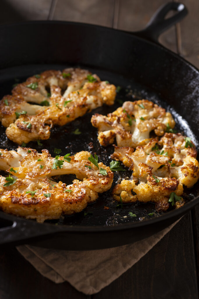 ; Coloque no fogo médio alto e deixe dourar totalmente um dos lados antes de virar a couve flor; ela deve ficar bem queimadinha de ambos os lados.; Espete um garfo para ver se a textura está de seu agrado, se ela ainda estiver dura diminua um pouco o fogo e tampe para ela cozinhar até o ponto desejado;; Na hora de servir finalize com um fio de azeite, ervas frescas,1 pitada de curry e pinoles torrados.; – Tempo de marinada opcional: 30 minutos