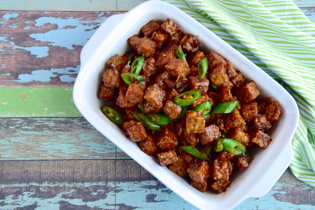 Mês 5[wpurp-searchable-recipe]TEMPÊH COM MOLHO BARBECUE DE TÂMARAS E ERVAS FRESCAS – – tempê (de sua preferência (em cubos de 2cm)), Marinada: shoyu, alho em pó, limão, laranja, gengibre (ralado), Molho Barbecue: tomate (médio sem semente), tomate seco (desidratado picadinho), tâmaras medjool (sem caroço ou ¼ xícara de melado de tâmaras (receita base)), shoyu sem glutamato, vinagre de maçã, azeite, fumaça líquida, dente de alho (picadinho), pimenta dedo de moça (sem semente picadinha), páprica defumada, cominho em pó, gotas de tabasco (ou mais), Marinada: Misture todos os ingredientes da marinada em um recipiente amplo.